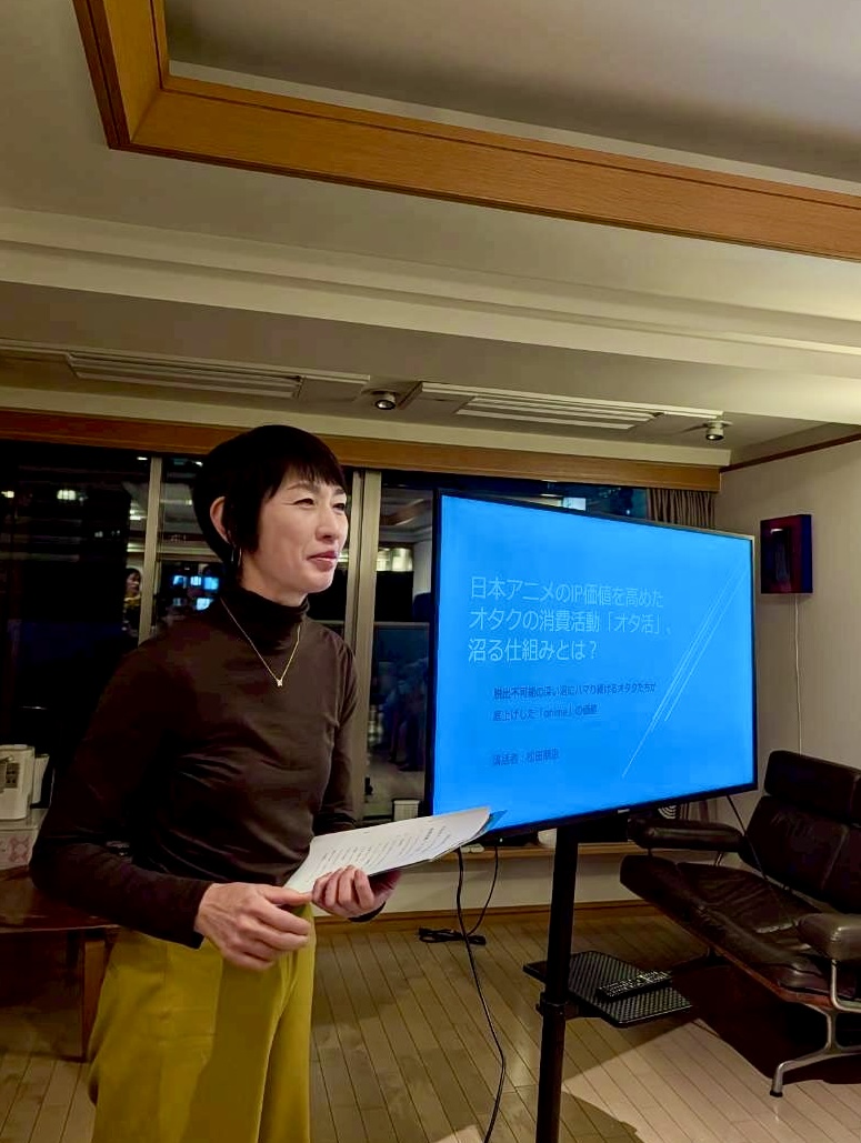 経営者や官僚、コンテンツ事業者を含むエンタメ業界、プロデューサー、クリエイター、医師などが集まるプライベートサロンで松田がスピーカーとして立ち、講話をしました。タイトルは「日本アニメのIP価値を高めた消費活動「オタ活」 沼る仕組みとは?」 今や、日本を代表するカルチャーとして確固たる地位を築き、日本のみならず世界中で経済効果を生んでいる「アニメ」。 わたし自身のオタ活や、オタクたちの生態、実際のアニメIP利用の例、海外展開の実例、海外のオタクの生態、などなど、これまで遊んだり取材してきたことなどを松田なりの分析と合わせて報告をした形です。予想以上の好評をいただきました!